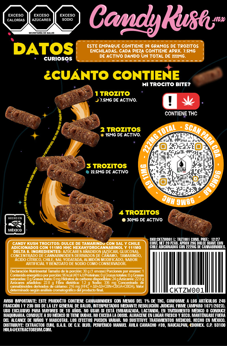 • Sabor atrevido: combinación única de dulce, ácido y enchilado que explota en cada bocado. • Pulpa natural: hechas con tamarindo real, enriquecidas con nuestra mezcla exclusiva de cannabinoides. • Formato práctico: 29g de trocitos enchiladas listas para compartir… o disfrutar solo. • Calidad garantizada: desarrolladas bajo el sello EXTRACTOS EUM™, con pureza y trazabilidad certificada. Pulpa natural te hacen agua la boca, y ese exceso de saliva ayuda a que tu cuerpo absorba directamente desde el primer bocado. Olvídate de esperar horas: sabor intenso, absorción express y efecto rápido. Elige tu tamaño y prepárate para despegar.